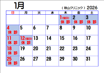 ●1月の休診カレンダー(2026年1月6日現在)
