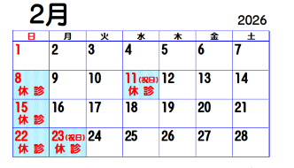 ●2月の休診カレンダー(2026年1月6日現在)